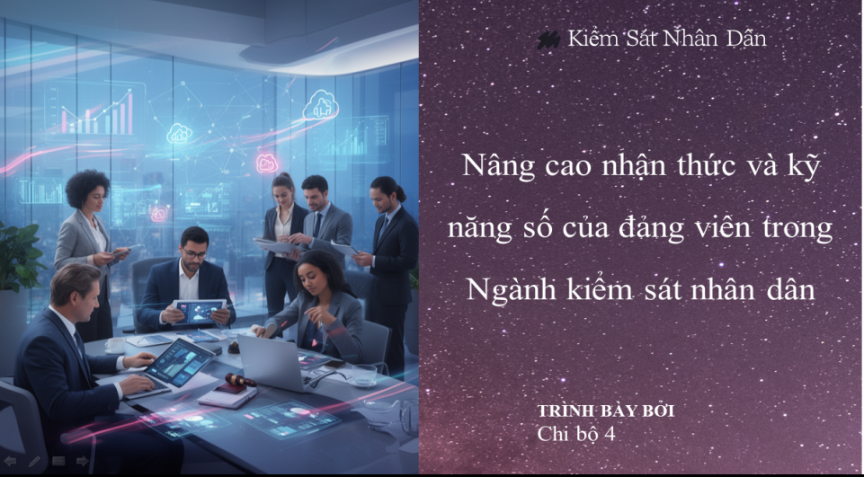 Tại buổi sinh hoạt, để đảng viên trong Chi bộ nắm được nội dung của chuyên đề sinh hoạt và sôi nổi tham gia phát biểu, được sự phân công của Chi uỷ, Bí thư Chi bộ, Tổ xây dựng chuyên đề đã trình chiếu slide thuyết trình về chủ đề sinh hoạt đến toàn thể đảng viên Chi bộ 4. Sau khi kết thúc bài trình chiếu, các đảng viên tham gia thảo luận sôi nổi về nhận thức và tầm quan trọng của chuyển đổi số đối với ngành kiểm sát nói chung và đối với Chi bộ 4 nói riêng. Theo đó, các đảng viên Chi bộ không chỉ được phổ biến những kiến thức cơ bản nhất về khái niệm chuyển đổi số, bản chất của quá trình này, cũng như vai trò của công nghệ số, trí tuệ nhân tạo (AI); mà còn xác định được nhiệm vụ của người cán bộ, đảng viên trong xu thế phát triển công nghệ số của thời đại mới. Khi chuyển đổi số được nhấn mạnh là cuộc cách mạng toàn dân, yêu cầu sự tham gia đồng bộ của mọi cá nhân, tổ chức và chính quyền, thì đảng viên phải là lực lượng tiên phong, gương mẫu nhất. Mỗi Đảng viên phải xóa bỏ tâm lý “ngại khó, ngại thay đổi”, không thể để tình trạng “máy tính hiện đại nhưng tư duy thủ công” làm ảnh hưởng đến tiến trình phát triển chung của xu thế xã hội. Đối với ngành kiểm sát nhân dân thì cán bộ, Kiểm sát viên, đảng viên có kiến thức công nghệ số và kỹ năng ứng dụng công nghệ số trở thành nhiệm vụ thường xuyên trong quá trình thực hành chức năng quyền công tố và kiểm sát hoạt động tư pháp. Từ đó, mỗi đảng viên Chi bộ luôn ý thức học tập không ngừng để nâng cao khả năng ứng dụng công nghệ vào công tác, biến công nghệ số thành “công cụ hỗ trợ hiện đại nhất, tốt nhất” phục vụ tốt hơn cho nhiệm vụ chuyên môn, góp phần hoàn thành tốt các chỉ tiêu kế hoạch công tác được giao.