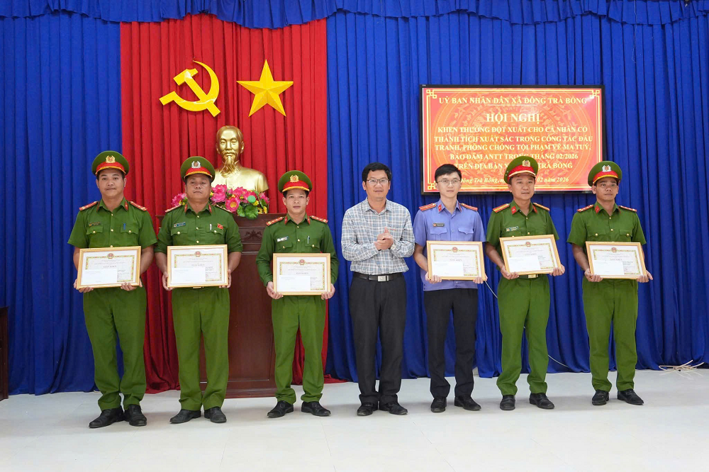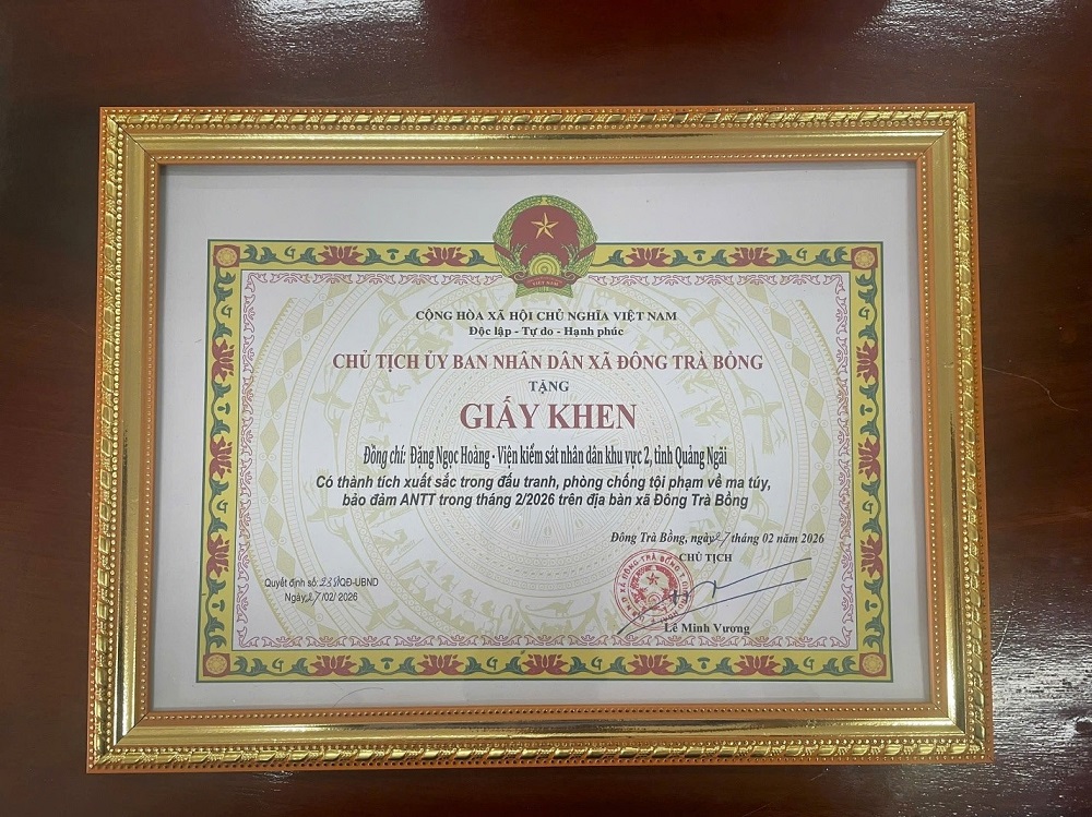 Vừa qua, Chủ tịch Ủy ban nhân dân xã Đông Trà Bồng trao tặng Giấy khen cho đồng chí Đặng Ngọc Hoàng - Viện Kiểm sát nhân dân khu vực 2 tỉnh Quảng Ngãi, vì có thành tích phối hợp xuất sắc trong công tác đấu tranh, phòng chống tội phạm về ma túy, góp phần bảo đảm an ninh trật tự trên địa bàn xã trong tháng 02 năm 2026