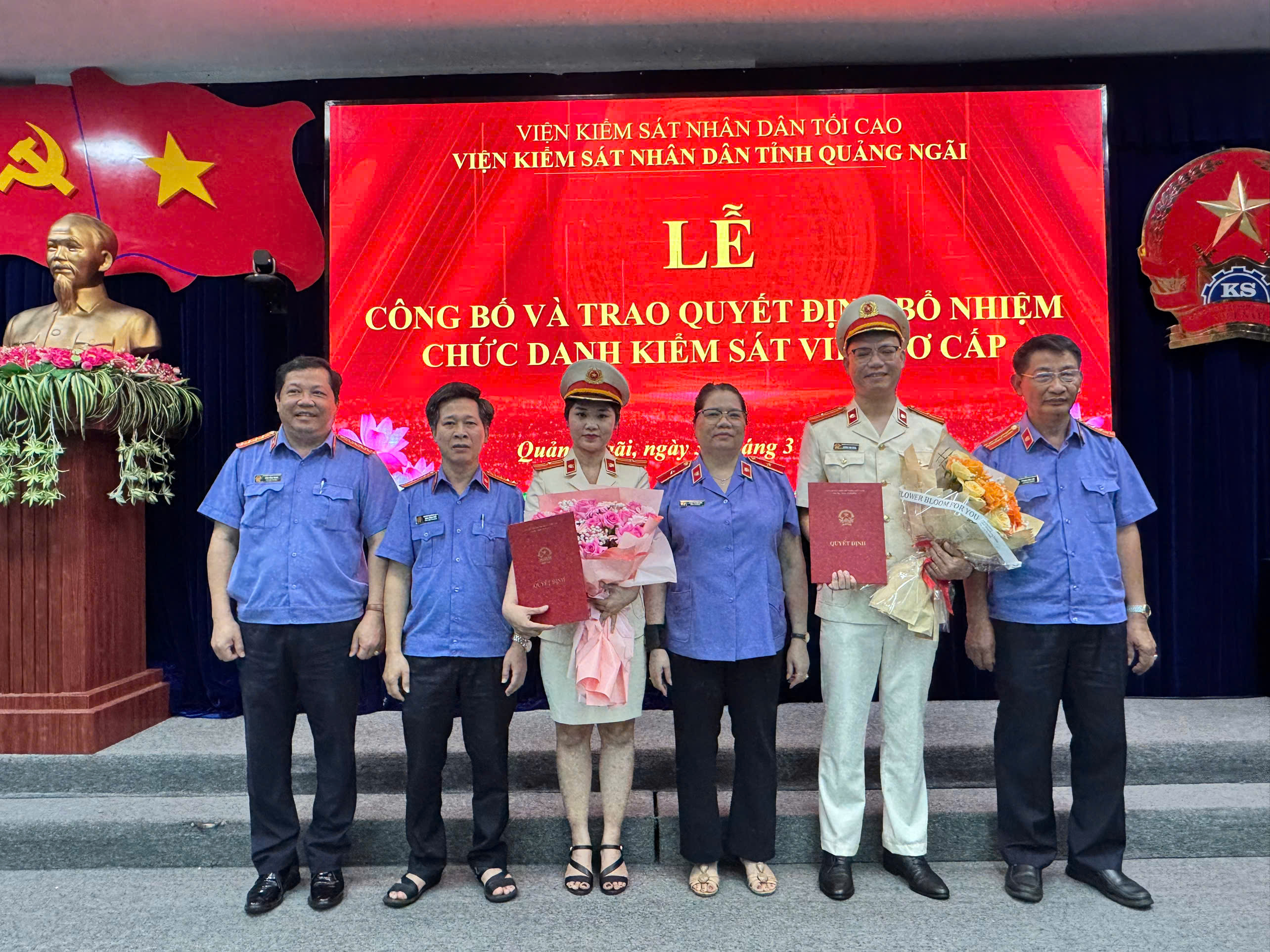 Tại buổi lễ, đồng chí A Thi – Trưởng phòng Tổ chức cán bộ công bố các quyết định của Viện trưởng VKSND tối cao về việc bổ nhiệm chức danh Kiểm sát viên sơ cấp nhiệm kỳ 5 năm, kể từ ngày 01/4/2026 cho các đồng chí: đồng chí Dương Văn Hùng, Nguyễn Thị Ánh Vân – Kiểm tra viên VKSND khu vực 7, tỉnh Quảng Ngãi.