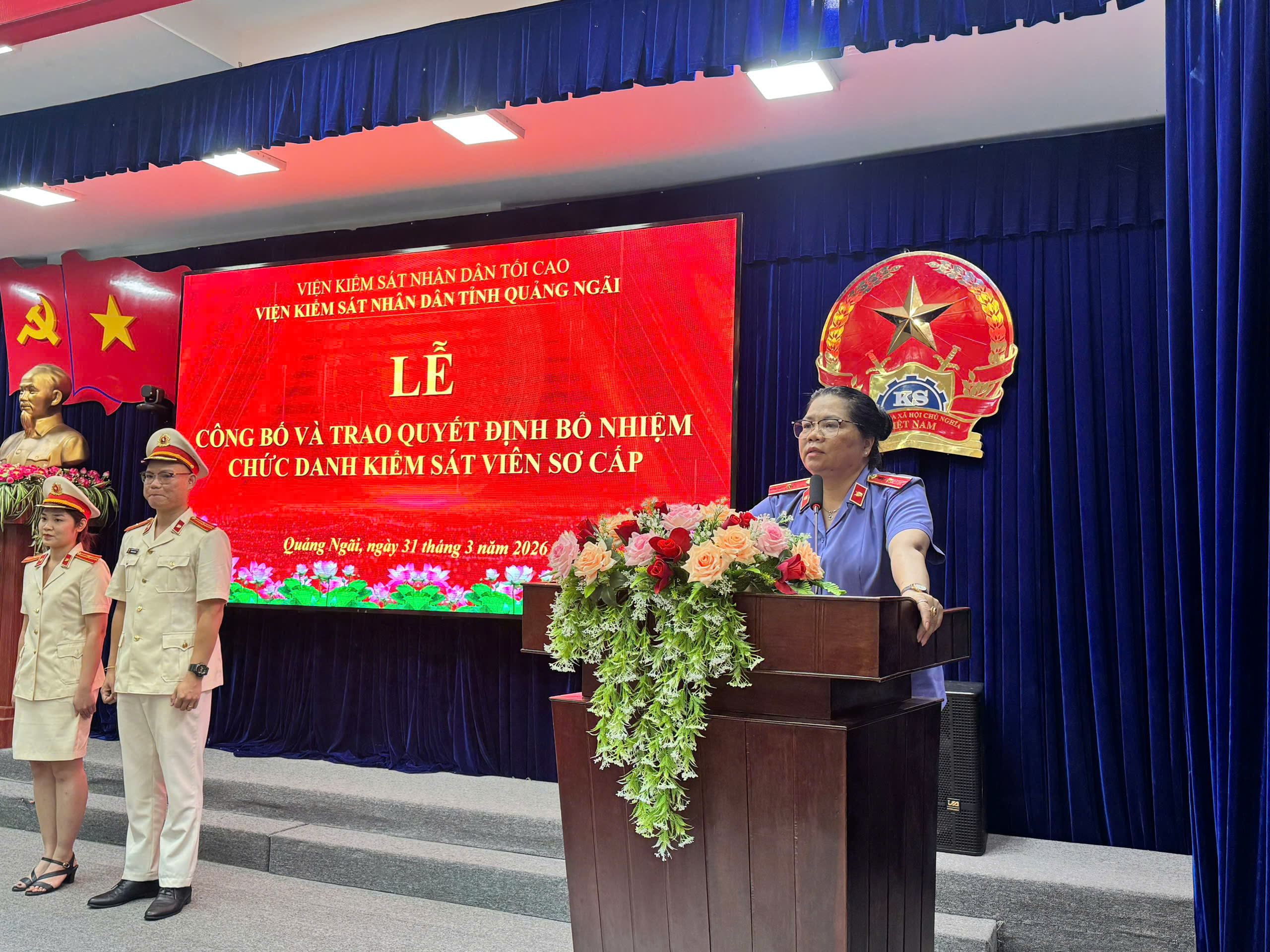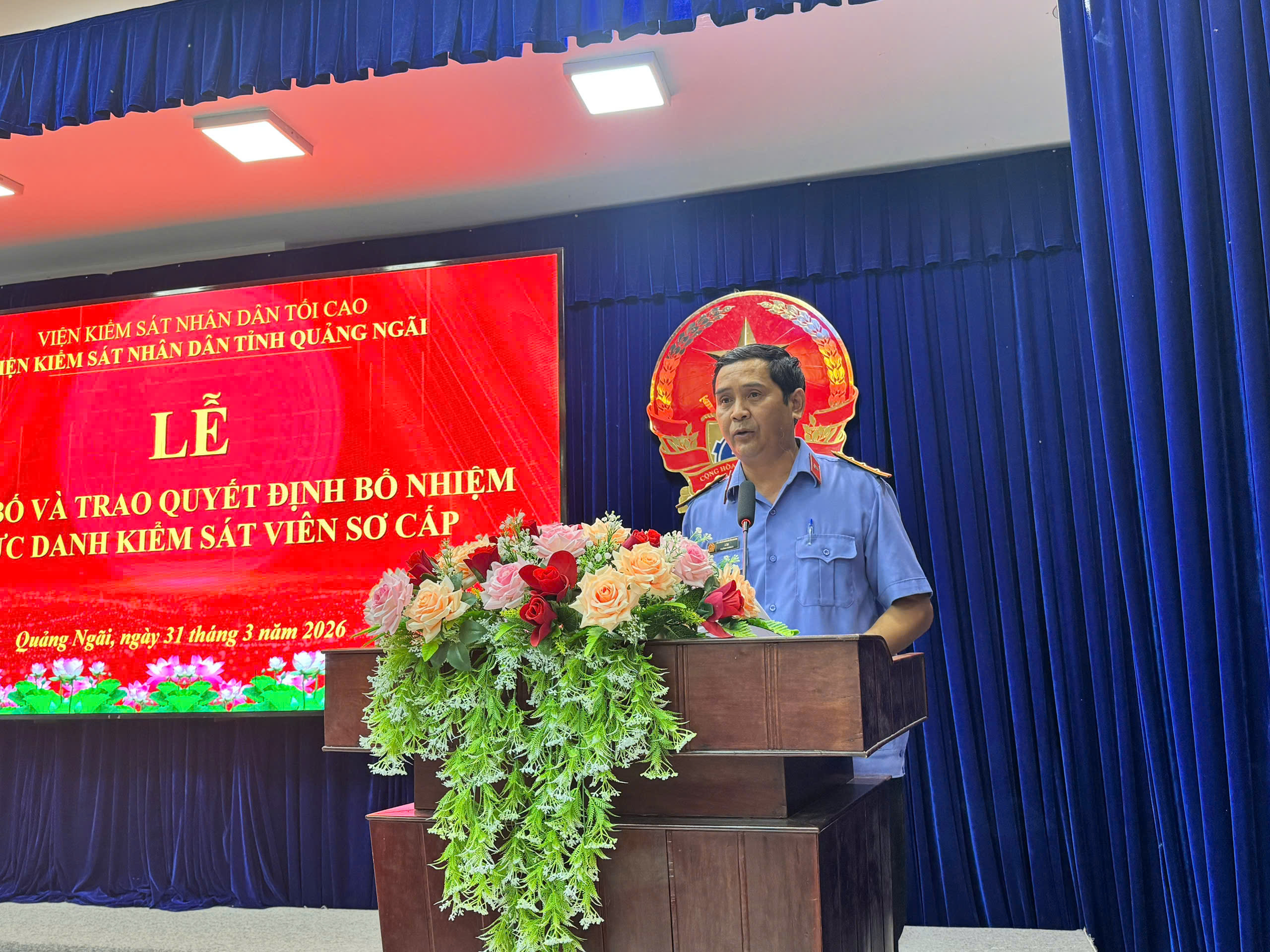 Thực hiện Quyết định số 157/QĐ-VKS ngày 26/4/2018 của Viện trưởng VKSND tối cao về quy định về lễ công bố và trao quyết định về công tác cán bộ; Sáng ngày 31/3/2026, tại VKSND tỉnh Quảng Ngãi, được sự ủy quyền của VKSND tối cao, VKSND tỉnh Quảng Ngãi đã tổ chức Lễ công bố và trao quyết định bổ nhiệm kiểm sát viên sơ cấp năm 2026.
