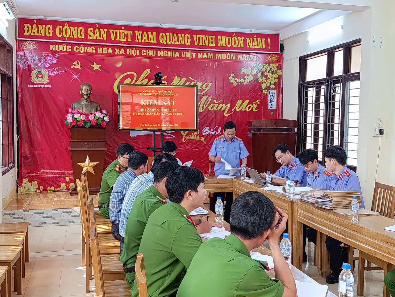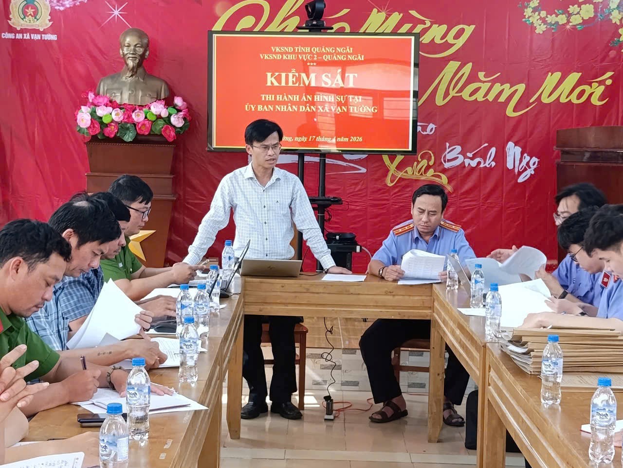 Thực hiện Quyết định số 193 ngày 30/03/2026 của Viện trưởng Viện KSND Khu vực 2 về việc trực tiếp kiểm sát việc thi hành án hình sự ngoài cộng đồng tại UBND xã Vạn Tường, ngày 17/04/2026, Đoàn kiểm sát trực tiếp do đồng chí Phạm Tấn Dương – Phó Viện trưởng Viện KSND Khu vực 2 làm trưởng đoàn cùng các cán bộ tại đơn vị là thành viên, đã tiến hành trực tiếp kiểm sát tại UBND xã Vạn Tường. Làm việc với đoàn kiểm sát có các đồng chí là Chủ tịch, các đồng chí Lãnh đạo, cán bộ Công an xã được kiểm sát.