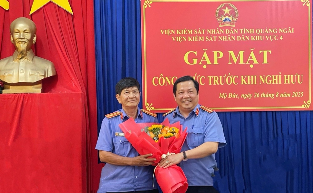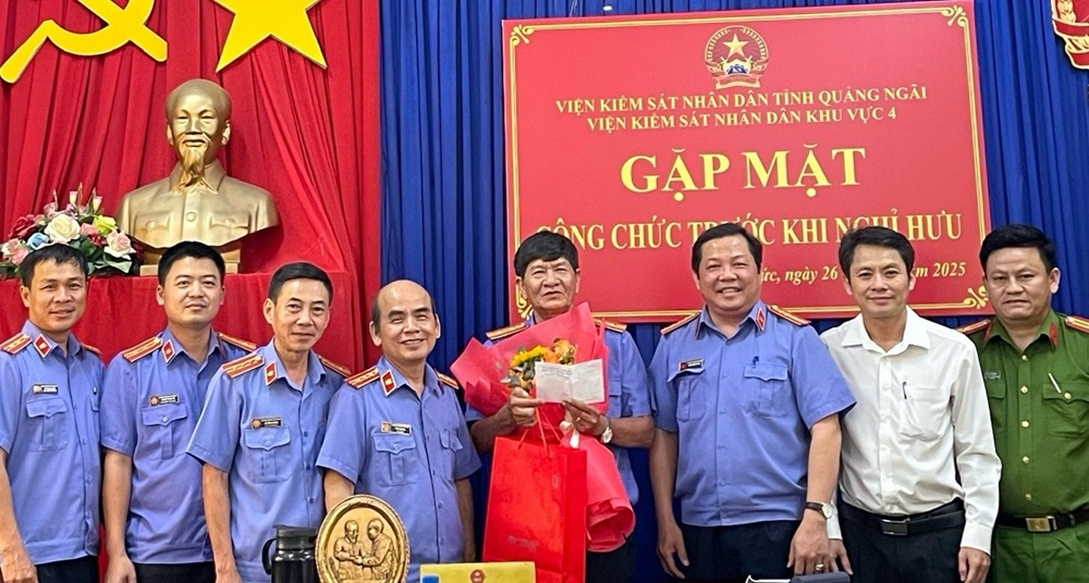 Chiều 26/8/2025, Viện KSND tỉnh Quảng Ngãi tổ chức buổi gặp mặt công chức trước khi nghỉ hưu đối với đồng chí Thiều Quang Tâm – Phó Viện trưởng Viện KSND khu vực 4. Tham dự buổi gặp mặt có đồng chí Đinh Hồng Thanh – Phó Viện trưởng Viện KSND tỉnh Quảng Ngãi, lãnh đạo các cơ quan, ban ngành địa phương cùng toàn thể công chức và người lao động của đơn vị.