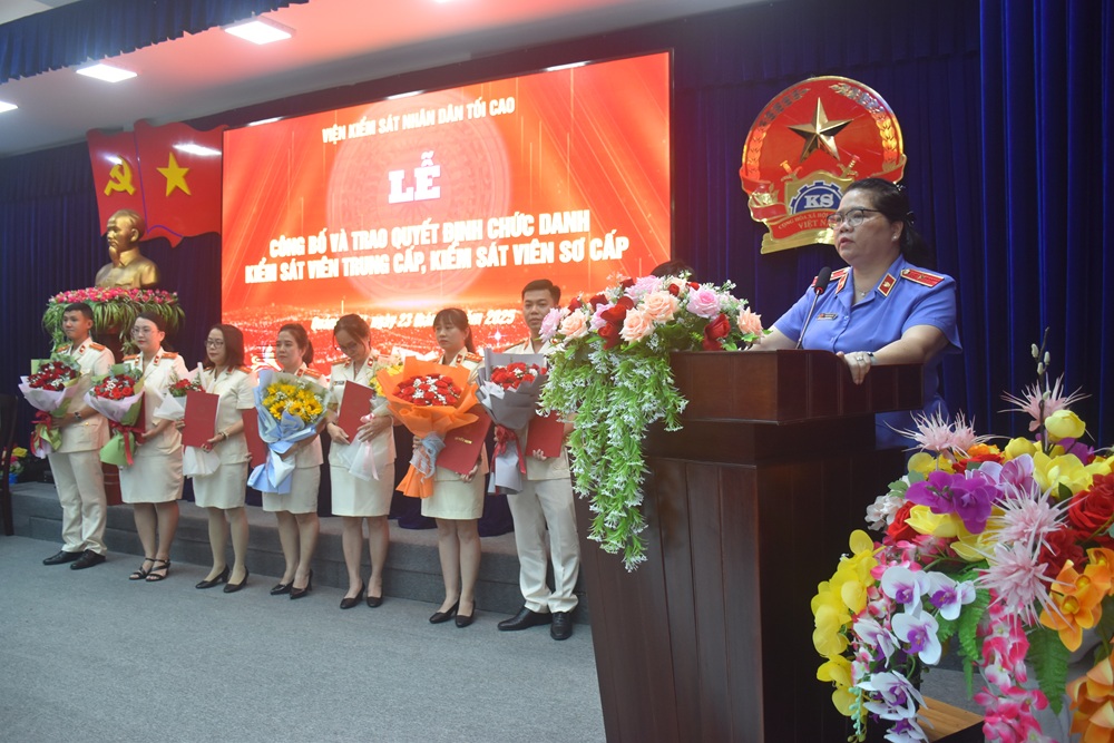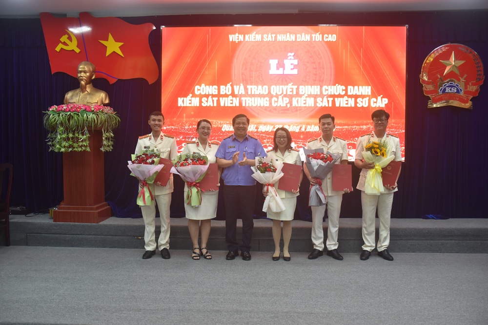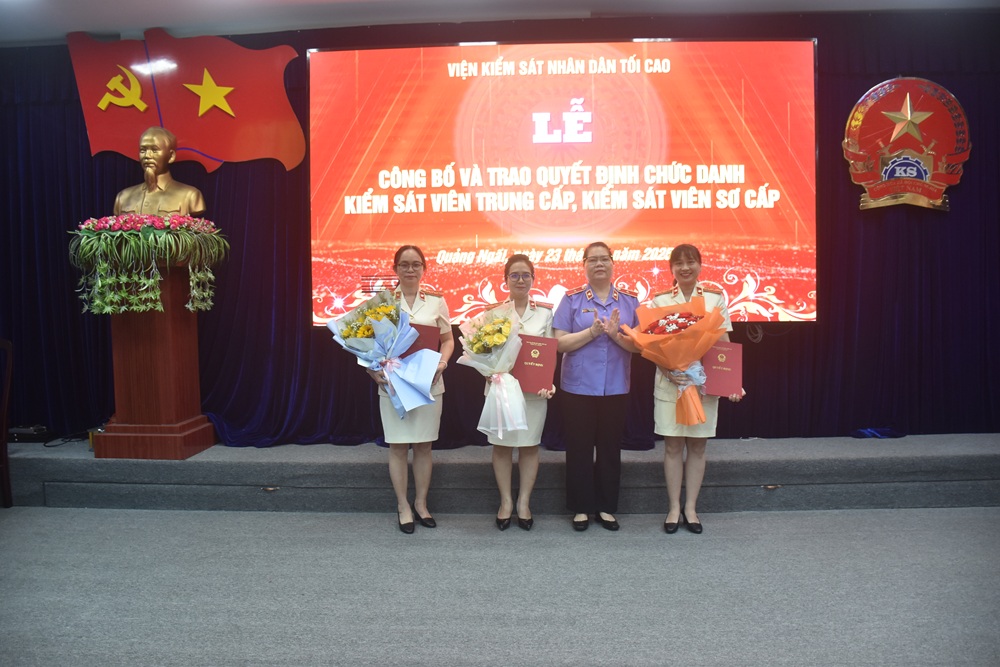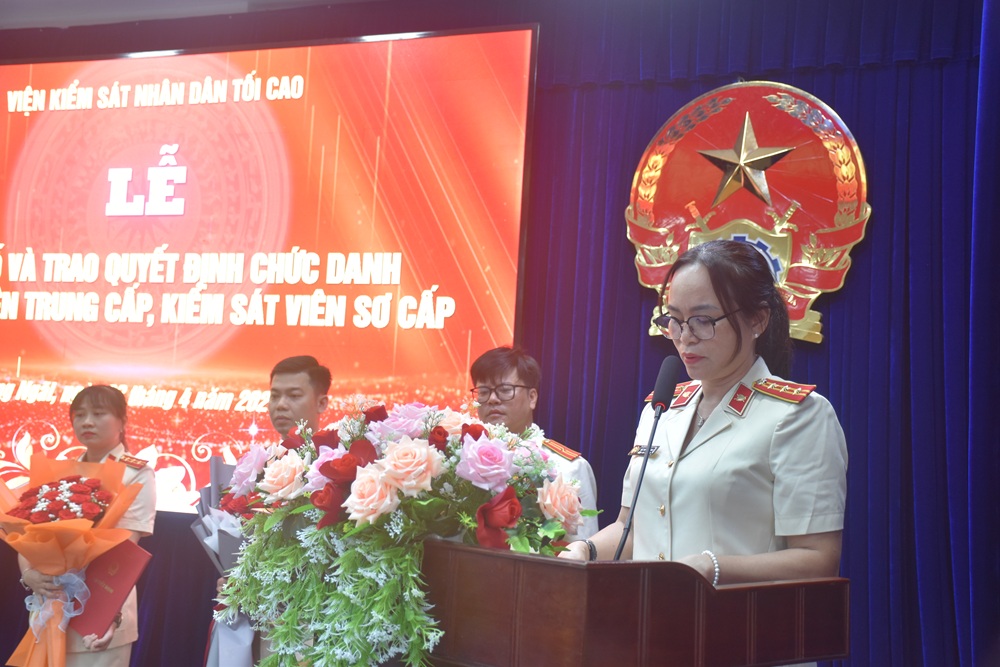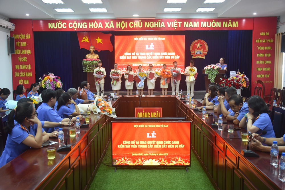 Tại buổi lễ, đồng chí Nguyễn Thị Phương Uyên – Phó Trưởng phòng Tổ chức cán bộ công bố các quyết định của Viện trưởng VKSND tối cao về việc bổ nhiệm chức danh Kiểm sát viên trung cấp nhiệm kỳ 10 năm, có hiệu lực kể từ ngày 16/4/2025 cho các đồng chí sau: Đồng chí Bùi Thị Tuyết Mai – Kiểm sát viên sơ cấp, Viện trưởng VKSND huyện Tư Nghĩa; Đồng chí Đặng Thị Minh Hiếu – Kiểm sát viên sơ cấp, Phòng kiểm sát việc giải quyết các vụ án hành chính, vụ việc kinh doanh thương mại và những việc khác theo quy định của pháp luật (Phòng 10); Đồng chí Trần Phi Phi – Kiểm sát viên sơ cấp, Phòng kiểm sát giải quyết các vụ, việc dân sự (Phòng 9). Và bổ nhiệm chức danh Kiểm sát viên sơ cấp nhiệm kỳ 5 năm cho các đồng chí: đồng chí Vũ Thị Kim Cúc – Kiểm tra viên Phòng kiểm sát việc tạm giữ, tạm giam và thi hành án (Phòng 8); đồng chí Nguyễn Thị Tuyết Mai – Kiểm tra viên VKSND huyện Nghĩa Hành; đồng chí Nguyễn Đức Thiện – Kiểm tra viên VKSND huyện Tư Nghĩa; đồng chí Phan Lê Anh Kiệt – Kiểm tra viên VKSND huyện Sơn Tây; đồng chí Ngô Quang Vũ – Kiểm tra viên VKSND huyện Trà Bồng.