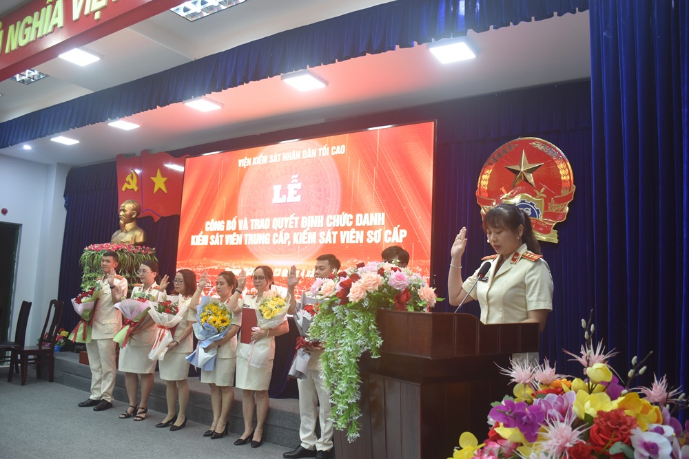 Phát biểu nhận nhiệm vụ, đồng chí Bùi Thị Tuyết Mai – Kiểm sát viên trung cấp Viện trưởng VKSND huyện Tư Nghĩa thay mặt các đồng chí được bổ nhiệm chức danh Kiểm sát viên cảm ơn Lãnh đạo VKSND tỉnh, các đồng chí Lãnh đạo đơn vị cùng các đồng nghiệp đã tạo điều kiện, giúp đỡ các đồng chí học tập, rèn luyện và tham gia kỳ thi tuyển Kiểm sát viên. Trên cương vị mới, các đồng chí hứa sẽ tiếp thu toàn bộ ý kiến chỉ đạo, giao nhiệm vụ của đồng chí Viện trưởng; tiếp tục tu dưỡng, rèn luyện đạo đức, nâng cao trình độ nghề, bản lĩnh nghiệp vụ, luôn cầu thị học hỏi, nỗ lực phấn đấu để hoàn thành tốt các nhiệm vụ được giao.