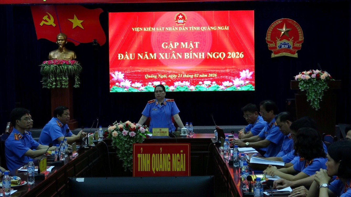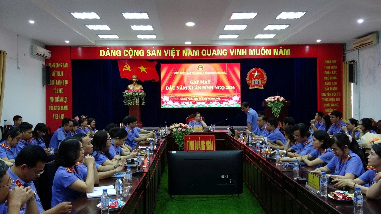 Sáng ngày 24/02/2026, Viện kiểm sát nhân dân tỉnh Quảng Ngãi tổ chức Hội nghị “Gặp mặt đầu năm Xuân Bính Ngọ 2026” nhằm đánh giá tình hình trước, trong và sau Tết Nguyên đán, đồng thời triển khai các nhiệm vụ trọng tâm ngay từ những tháng đầu Xuân Bính Ngọ 2026. Hội nghị được tổ chức dưới hình thức trực tiếp và trực tuyến đến hai cấp, có sự tham dự của tập thể lãnh đạo Viện, lãnh đạo các Phòng thuộc VKSND tỉnh, lãnh đạo các VKSND khu vực và toàn thể công chức, người lao động hai cấp.