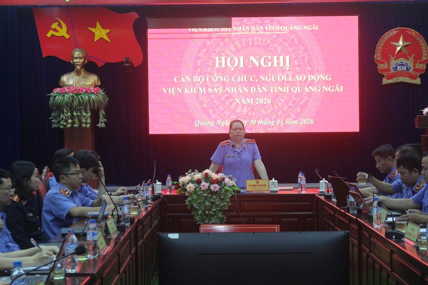 Sáng ngày 30/01/2026, Viện kiểm sát nhân dân tỉnh Quảng Ngãi tổ chức Hội nghị cán bộ, công chức, người lao động năm 2026. Tham dự Hội nghị có tập thể Lãnh đạo VKSND tỉnh cùng toàn thể cán bộ, công chức, người lao động VKSND tỉnh Quảng Ngãi do đồng chí Phạm Thị Kim Liên – Tỉnh uỷ viên, Viện trưởng VKSND tỉnh Quảng Ngãi chủ trì.